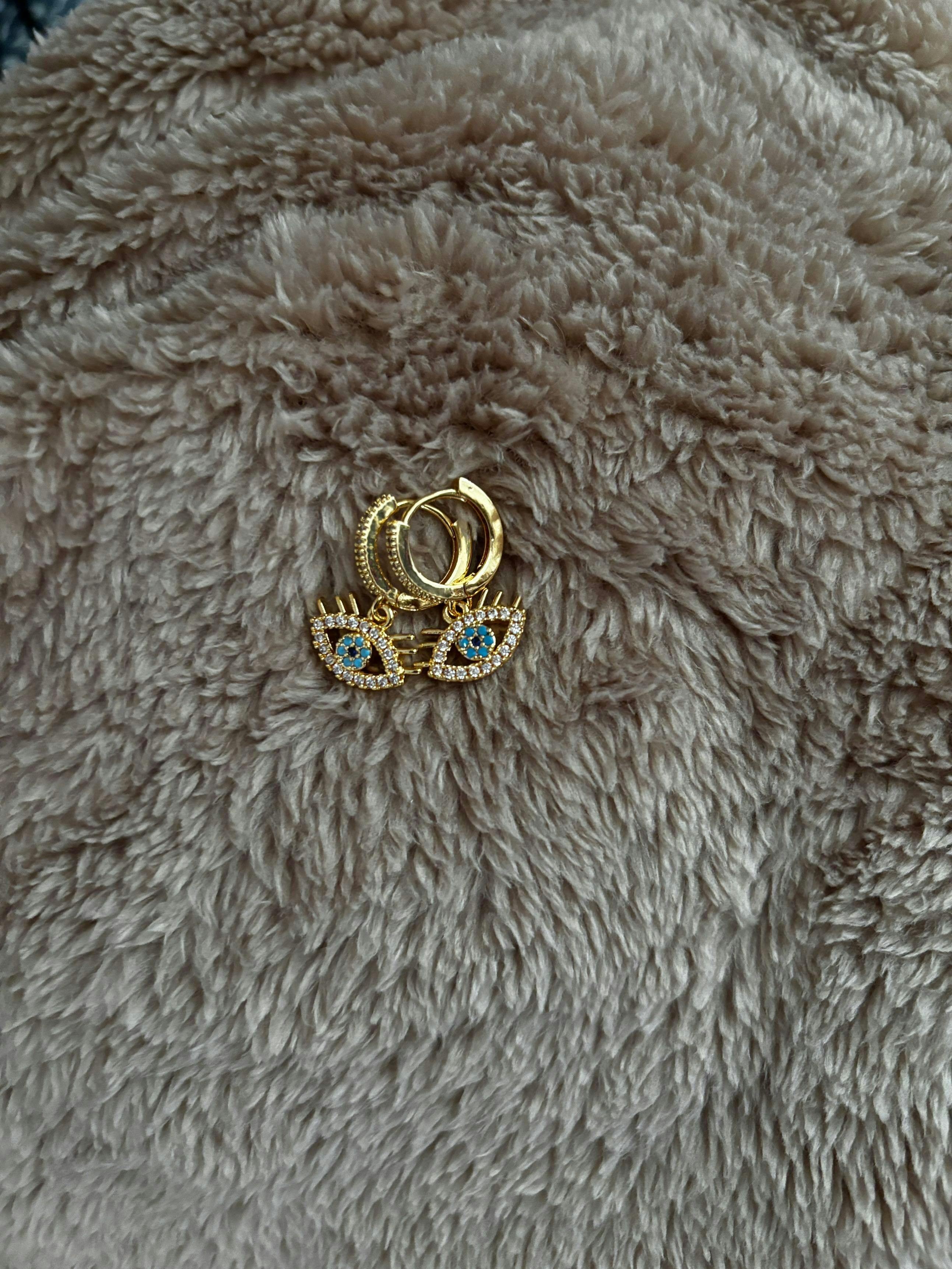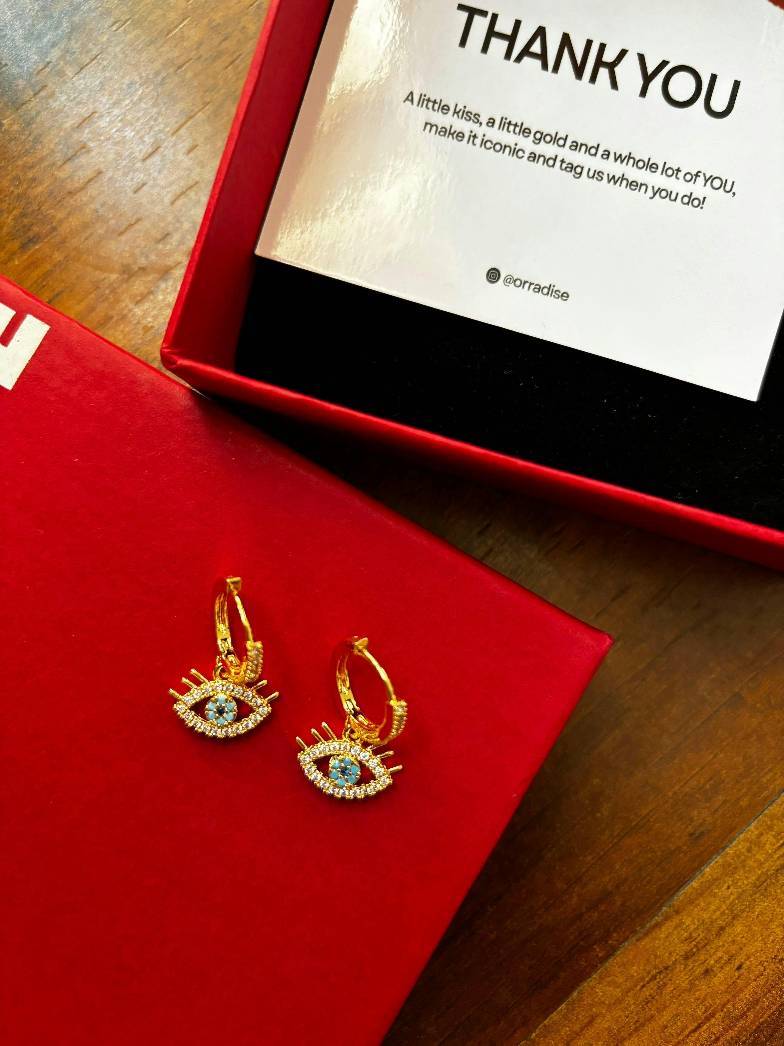 A modern talisman for the style-conscious soul. These evil-eye hoops blend sleek curves with a hint of mystique offering both statement and subtlety in one design. Crafted for the woman who loves her accessories to be as protective as they are polished.