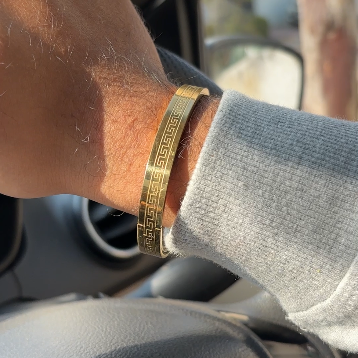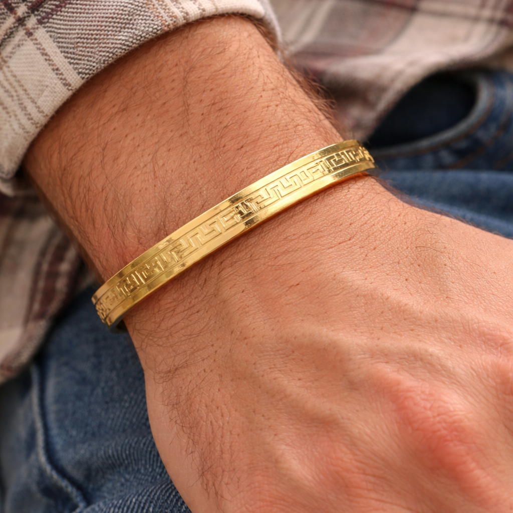 The Imperial Band is a distinguished men's bracelet crafted in gleaming gold, designed to elevate any wardrobe with timeless sophistication. This piece combines classic elegance with contemporary styling, making it versatile enough for both formal occasions and refined everyday wear. The smooth, polished finish catches light beautifully, while the substantial weight provides a reassuring presence on the wrist. Whether worn alone as a statement piece or layered with other accessories, this bracelet exudes confidence and refined taste. An essential addition to any discerning gentleman's jewelry collection.