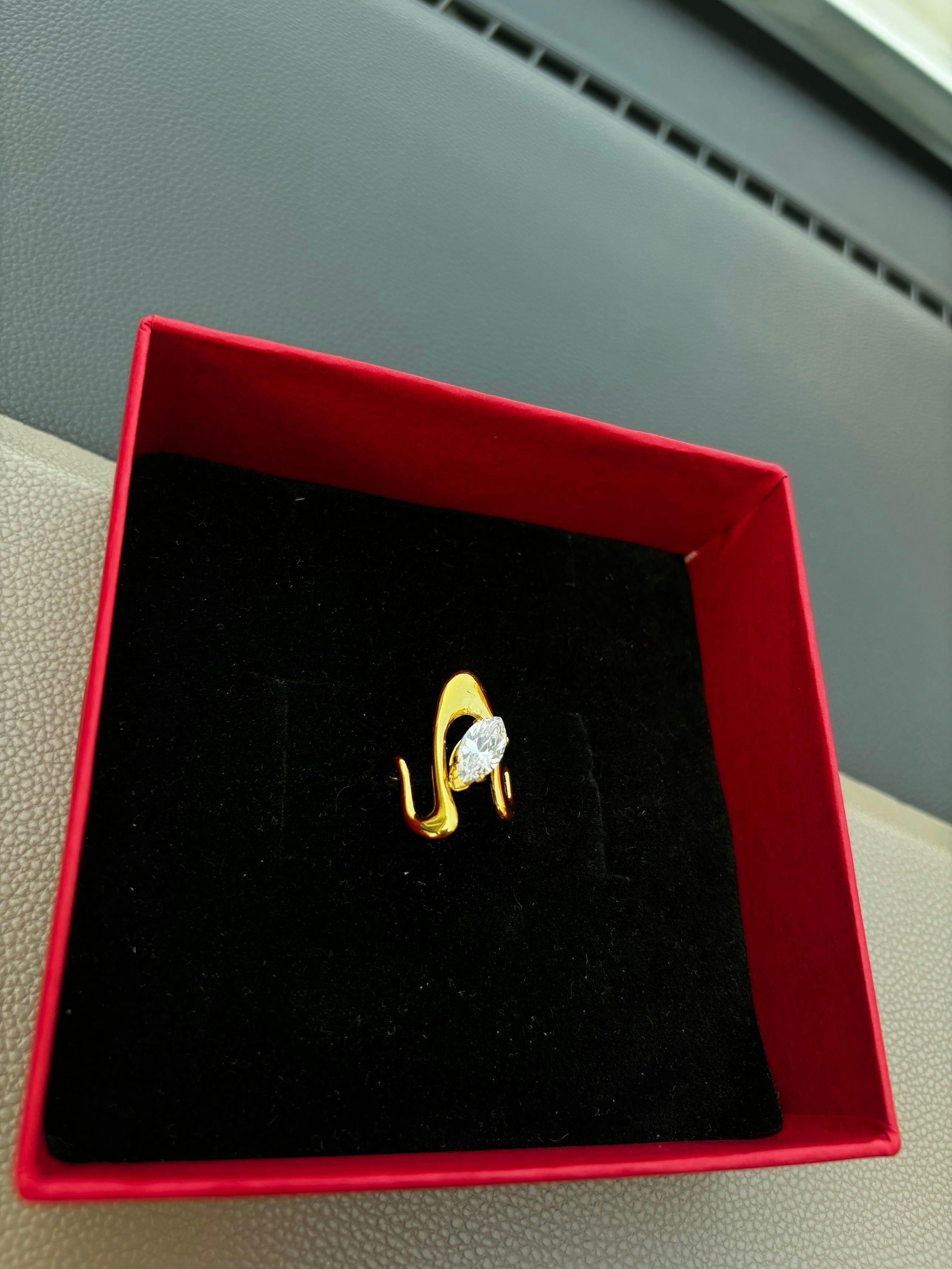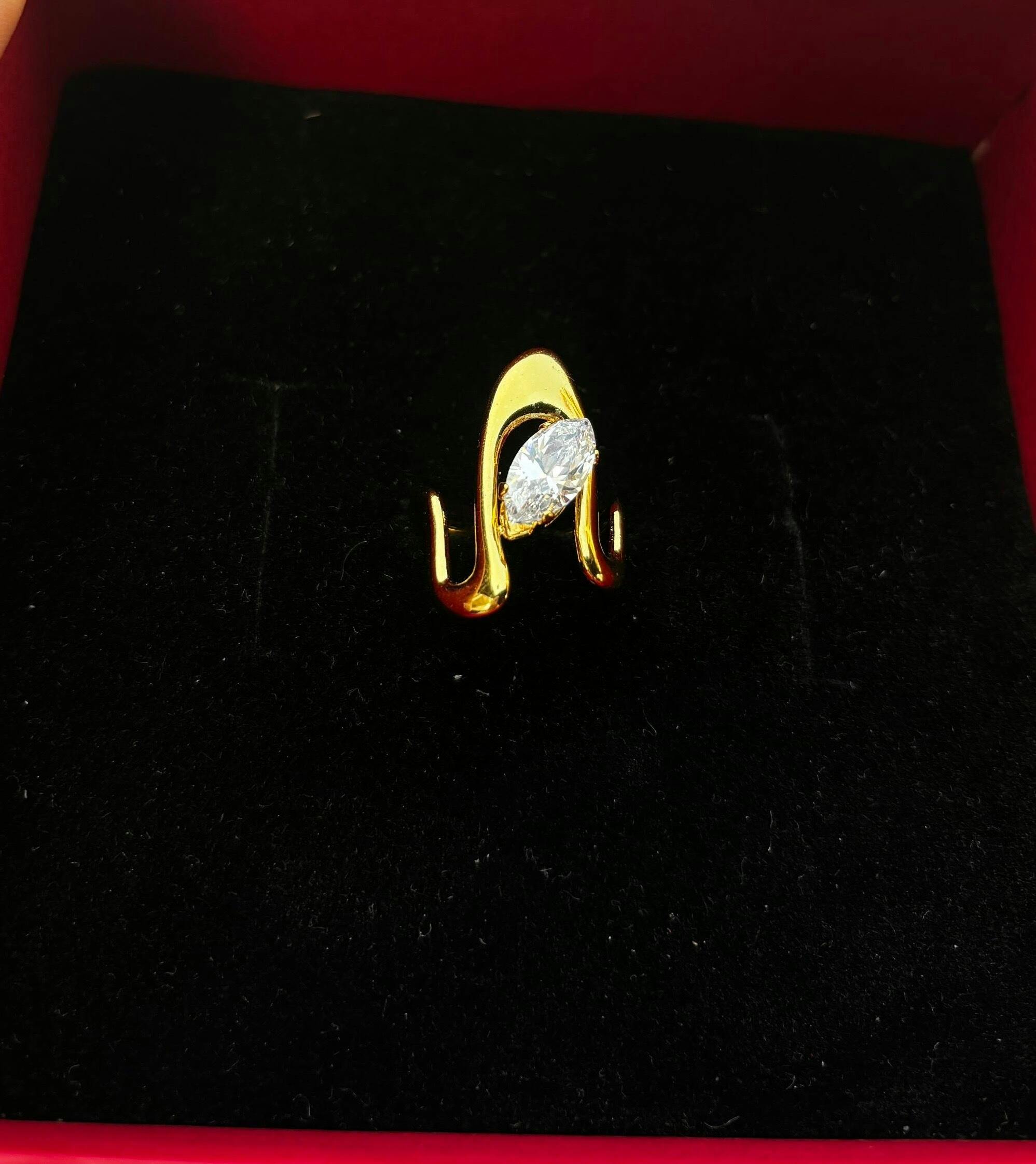 This statement ring features a marquise-cut crystal set in a sculptural gold-plated frame, blending elegance with an edgy contemporary vibe. Designed to be anti-tarnish, waterproof, and hypoallergenic, Zyra is your forever piece that doesn’t just accessorize but transforms your look. Whether worn solo for a minimal chic appeal or stacked with dainty bands, Zyra adds that irresistible sparkle with a touch of luxury.
